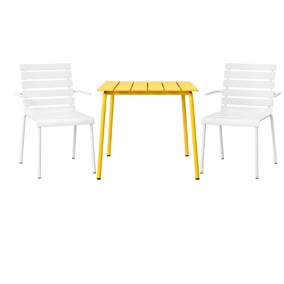 Let op: deze set bevat 1x Tuintafel S off-white en 2x Tuinstoelen yellow MET armleuningen.