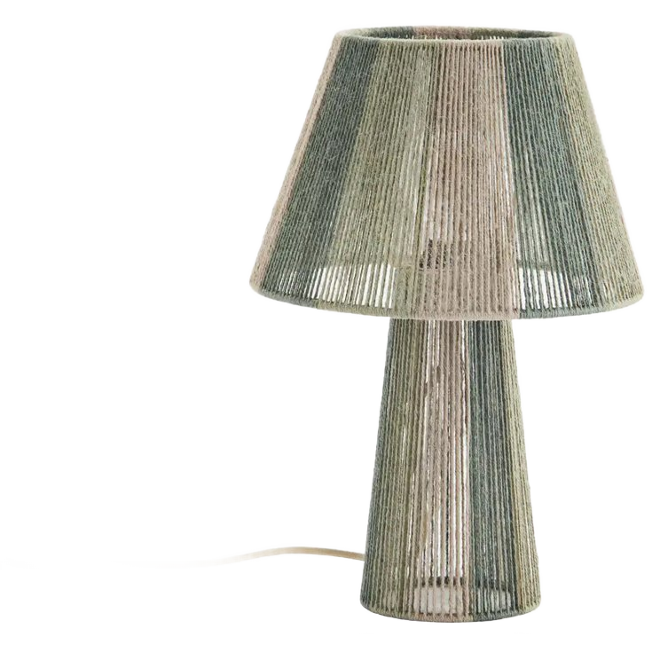Handgemaakte tafellamp van Madam Stoltz. De lamp heeft een kap van jute koord in groen en naturel tinten.