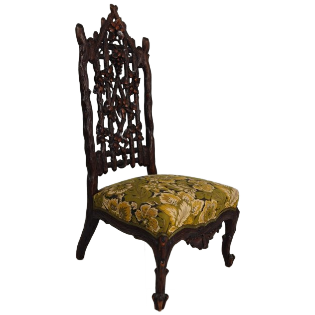 Dit is een prachtig vervaardigde armstoel in Zwarte Woud-stijl uit de 19e eeuw, rijkelijk gesneden met druiventros- en bladmotive. Toegeschreven aan de prestigieuze Haagse meubelmaker Horrix, actief rond 1870.