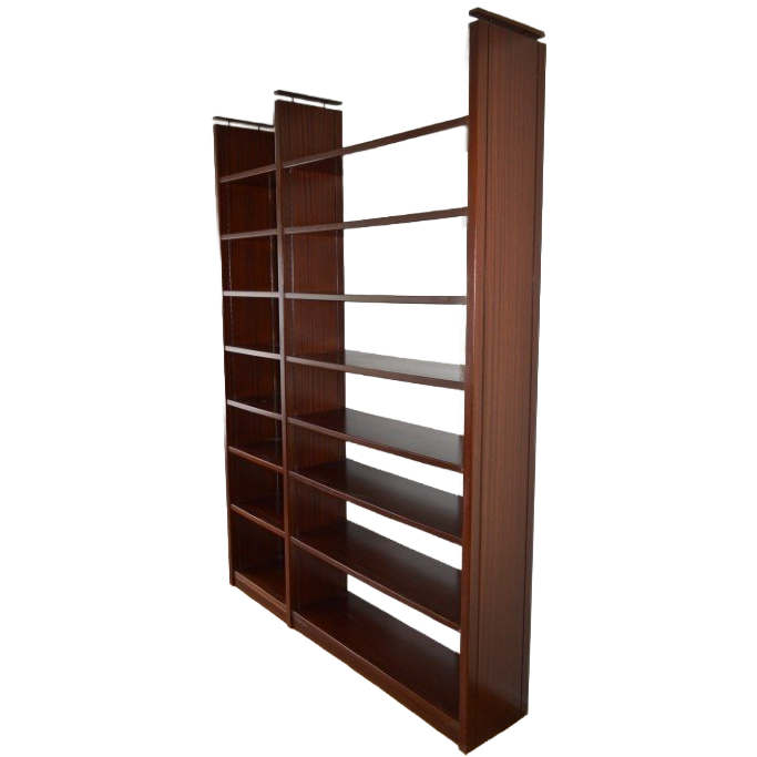 L 177 x B 35 x H 250 cm Vintage boekenkast of systeem wandkast gemaakt rond 1980. De hout van de kast is bekleed met mahoniefineer. Een fantastische kast met 16 horizontale planken die door het systeem in de staanders worden gedragen. Er komt geen schroef in het hout aan te pas. De staanders worden tegen het plafond vast geklemd door de latjes aan de bovenkant. De schappen kunnen versteld worden. Het is een tweedehands kast met gebruikssporen. Van 1 schap is een borgbeugeltje kapot. De kast wordt gedemonteerd geleverd. Alle items die wij verkopen zijn tweedehands/retro/vintage/antiek en gebruikt, dus bekijk de foto's voordat u koopt.