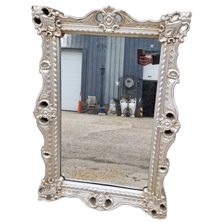 Deze prachtige brocante spiegel, vervaardigd uit hoogwaardig kunststof, is een verfijnde toevoeging aan elk interieur. Met zijn sierlijke barokke lijst in een elegante zilveren kleur, straalt deze spiegel een tijdloze charme uit die perfect past in zowel klassieke als moderne omgevingen.
