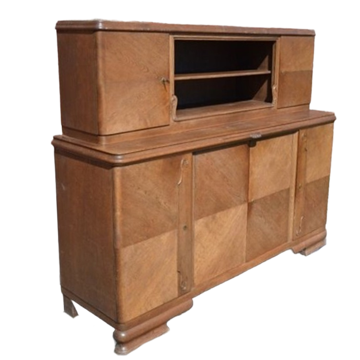 L 220 x B 62 x H 160.5 cm Een elegante Biedermeier buffetkast uit de jaren 1930, vervaardigd met grote vakmanschap. Deze mooie drankenkast is gemaakt in Duitsland. Pure Art Deco-geometrische lijnen, verzacht door elegante rondingen van de hoeken. Een dressoir met bovenkast die deuren heeft zonder handgrepen voor een strakke, tijdloze uitstraling. Een uitschuifbaar serveerblad perfect als bar. Het is natuurlijk een veelgebruikte tweedehands buffetkast uit het begin van de vorige eeuw en hij heeft gebruikssporen. Er zijn (nog) geen glasdeurtjes bij en er is maar 1 sleutel. Een paar stukjes fineer missen. De kast bestaat uit 2 delen. Alle items die wij verkopen zijn tweedehands/retro/vintage/antiek en gebruikt, dus bekijk de foto's voordat u koopt.
