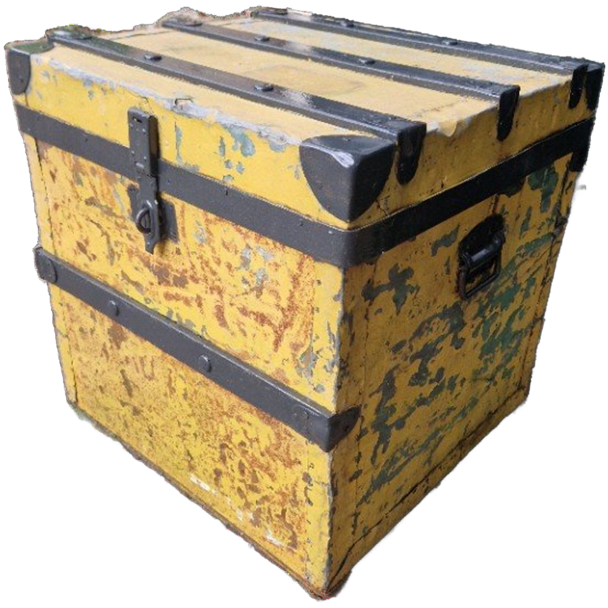 50x47x51 Gave decoratieve oude kist. Hout van binnen en metaal aan de buitenkant met houten banden. Zeer decoratief en praktisch. Geleefd, Fraaie patina. Sluit goed. Bijzettafel salontafel speelgoedkist Decoratie, vintage legerkist.