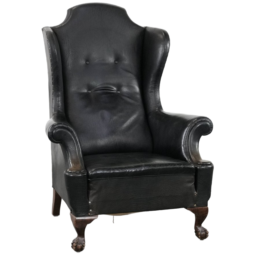 Aangeboden deze grote antieke zwarte Engelse rundleren oorfauteuil uit eind 19e eeuw met een luxe uitstraling.
