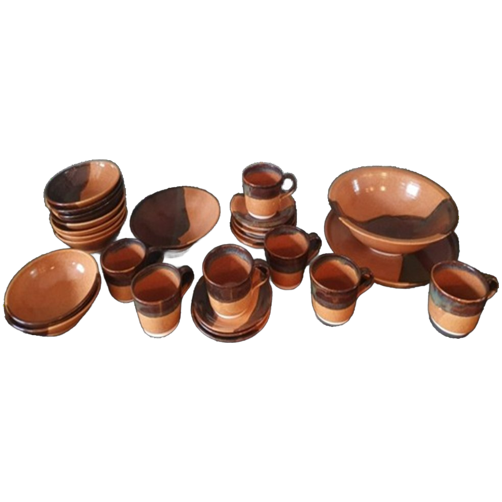 Vintage Servies met donker amber, bruin blauw/groen achtige aardentinten in mooi glazuur handgemaakt studioaardewerk / keramiek. merk onbekend.