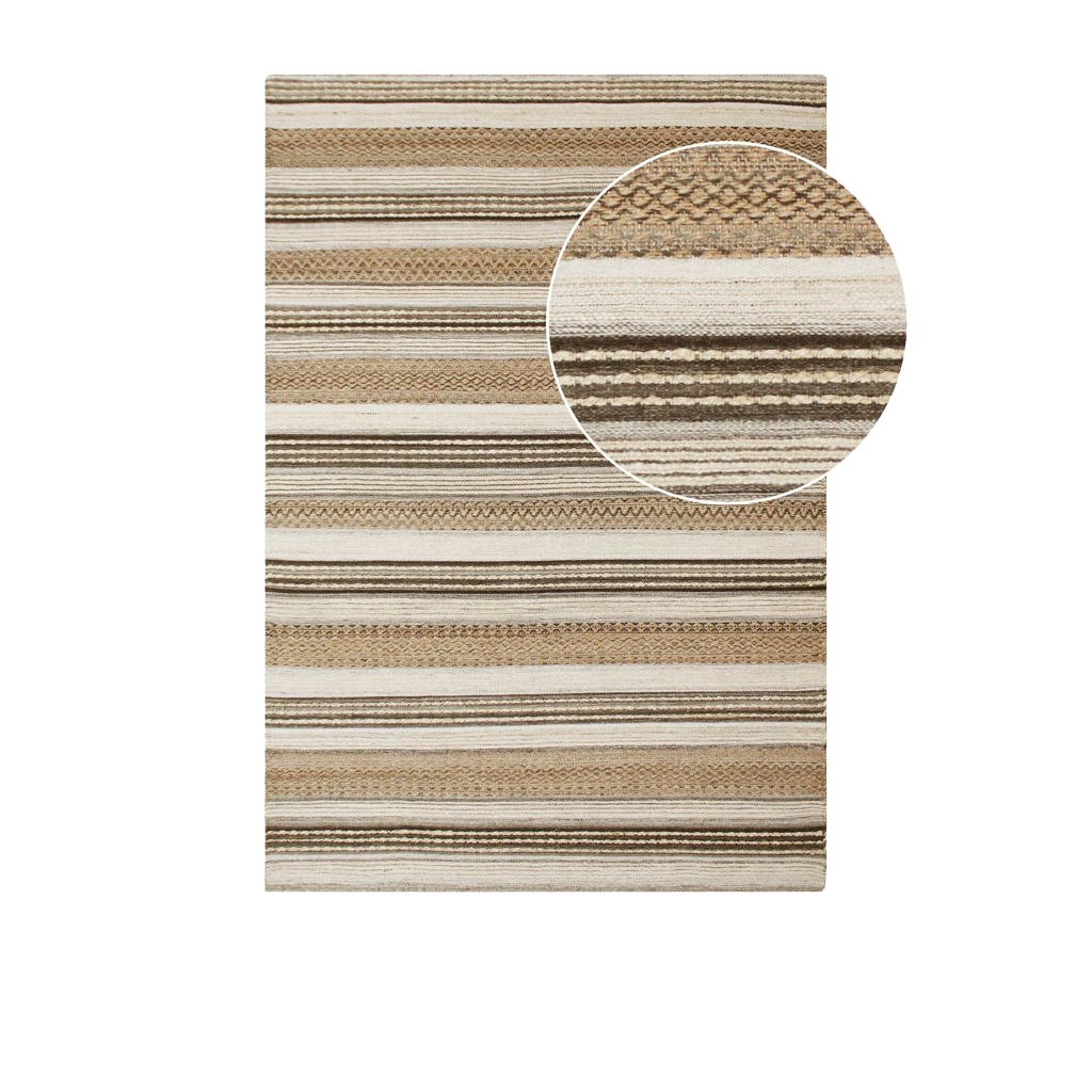De horizontale strepen in verschillende texturen en tinten creëren een rustige, natuurlijke sfeer. De neutrale kleuren passen in vrijwel elk interieur, van minimalistisch tot bohemian. Combineer het kleed met een bank of stoelen voor een warme en uitnodigende setting.