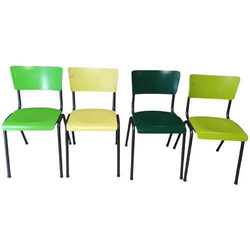Deze set van vier stoelen voegen een speelse en kleurrijke uitstraling toe aan elke eetruimte. De stoelen zijn uitgevoerd in verschillende tinten groen , wat zorgt voor een vrolijke sfeer. Het stevige metalen frame biedt stabiliteit en duurzaamheid, terwijl de houten zittingen comfortabel zijn voor langdurig gebruik.