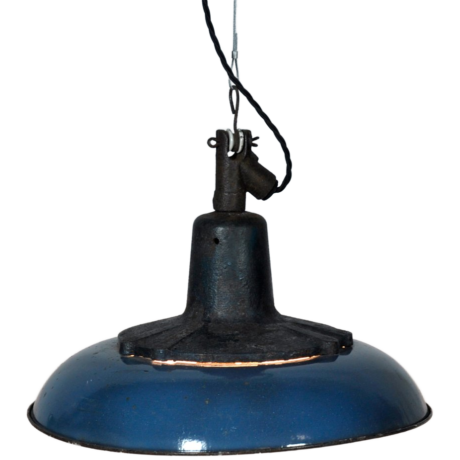 Geef je interieur een stoere, tijdloze uitstraling met deze originele industriële lamp uit de jaren ’50. Dit robuuste model is voorzien van een zware gietijzeren bovenzijde en een prachtig blauw geëmailleerde kap, wat zorgt voor een karaktervolle vintage look. De lamp ademt pure fabriekshistorie en is ideaal voor liefhebbers van industrieel design, loft-interieurs of als statement piece boven een eettafel, kookeiland of werkplek. De lamp is voorzien van nieuwe fitting en bedrading. Op te hangen met een bijgeleverde in hoogte verstelbare staaldraad. Afmetingen (h x d x b): 30 x 40 x 40 cm Ref: 25231