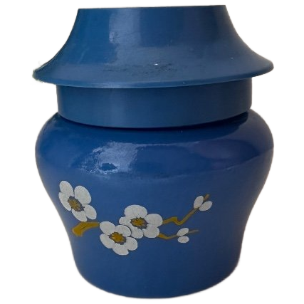 Super schattig blauw kunststof potje met wit bloesemtakje. Oorspronkelijk uitgebracht door Avon in de jaren ’70 – waarschijnlijk gevuld geweest met crème of vaste parfum. Leuk als decoratief doosje, om iets kleins in te bewaren of voor je vintage beautycollectie! Merk: Avon Materiaal: kunststof Periode: jaren ’70 Kleur: helder blauw met wit/geel bloesemmotief Hoogte: ca. 7 cm