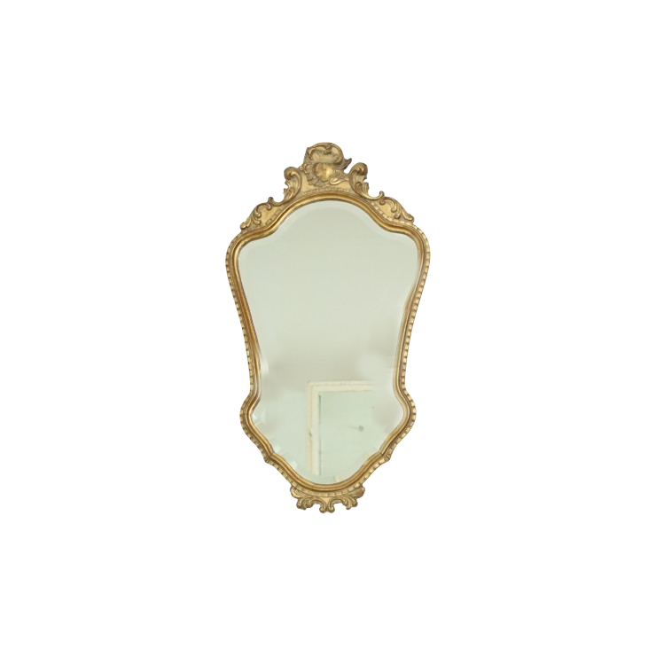 Mid-century Deknudt spiegel in klassieke houten lijst dat met bladgoud verguld is, het spiegelglas is facetgeslepen, de spiegel is volledig in barok stijl, België, jaren 50. Belgisch huis Deknudt, gespecialiseerd in spiegels en opgericht in 1946, ze staan bekend om hun topkwaliteit en elegant en tijdloos design. Deze vintage spiegel draagt een mooie ouderdomspatine, de lijst is elegant en sierlijk gedecoreerd met acanthusbladeren en een patroon rondom. Deze mooie spiegel verkeert in goede vintage conditie, met ouderdoms-en gebruikssporen passend bij de leeftijd, het spiegelglas is licht bespot, lichte sporen aan de achterkant van de lijst bovenaan, barstjes in de houten lijst door ouderdom, het geheel is nog zeer solide en stevig, kwalitatief vervaardigd, check de foto’s voor meer details! Afmetingen: 75x41x3cm. Gewicht: 4,446kg.