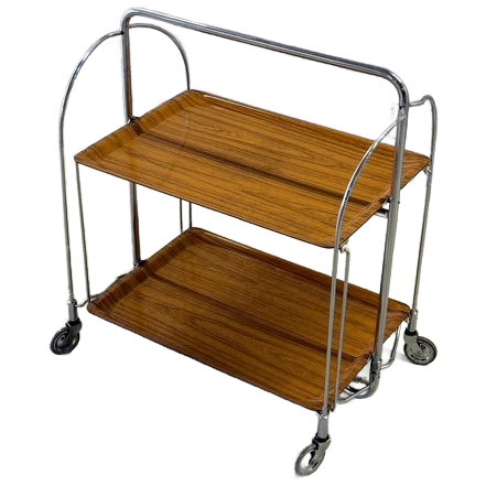Serveerwagen van Bremshey & Co uit de jaren ‘70. De trolley heeft twee houten dienbladen op een verchroomd metalen frame met wielen. De trolley is opvouwbaar.