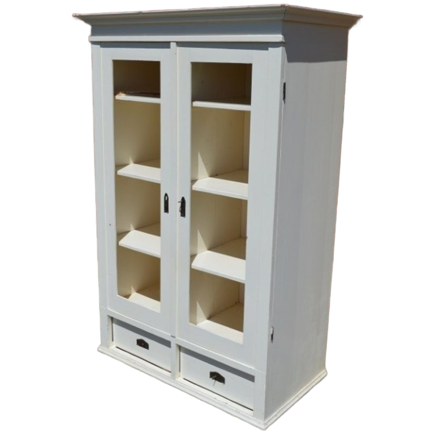 L 122 x B 62 x H 180.5 cm Deze brocante vitrinekast of kledingkast is gemaakt van grenenhout en wit geschilderd. De kast heeft twee afsluitbare deuren met panelen. Maakt u in plaats van de panelen glas in de deuren dan hebt u een prachtige vitrinekast. Binnenin zijn drie nieuwe planken gemaakt. Onder de deuren zitten twee mooie diepe laden. De kast bestaat uit één geheel. Het is een retro kast met gebruikssporen. De panelen uit de deuren en een paar lijstjes die gelijmd moeten worden zitten er los bij. Het is dus een mooie kast maar er zit een beetje opknapwerk in. Alle items die wij verkopen zijn tweedehands/retro/vintage/antiek en gebruikt, dus bekijk de foto's voordat u koopt.