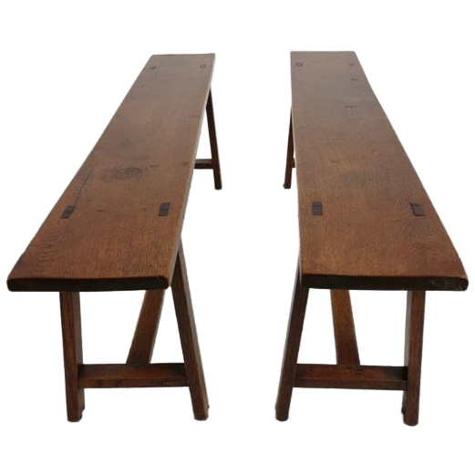Een prachtig paar antieke Franse boerderijbanken uit de 19e eeuw, gemaakt van massief eikenhout. Deze charmante banken zijn voorzien van traditioneel timmerwerk en hebben een mooie patina. Ze zijn super stevig en in goede staat, met de verwachte gebruikssporen die passen bij de leeftijd – zie de foto's voor details. Afmetingen (per bank): Breedte: 160 cm Diepte: 23,5 cm Hoogte: 45 cm Perfect om een rustiek karakter toe te voegen aan een hal, eettafel of tuinkamer.