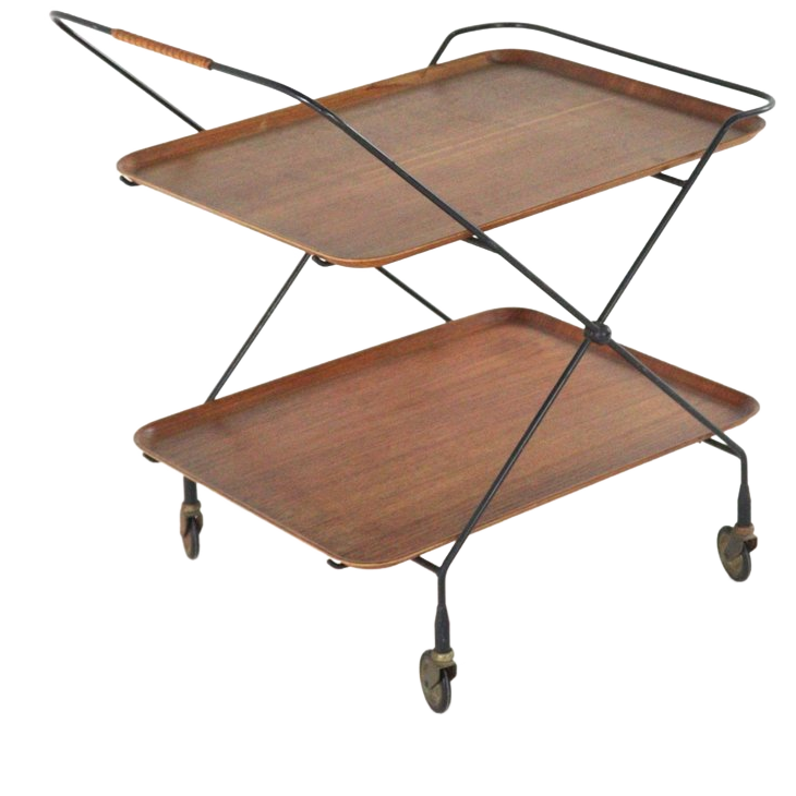 Erg handige en leuke, stijlvolle vintage serveerwagen. Het frame is gemaakt uit zwart gelakt metaal en staat op wielen, het geheel is tevens in te klappen.