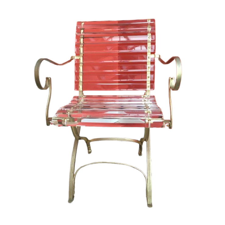 Super mooie stoel met volle acrylaat/plexiglas latten en een goudkleurige messing basis en armleuningen. Prachtige stoel met mooie gebogen lijnen, dus zeer speels en een echte eyecatcher in je woning, zaak, winkel. Zit zeer goed. Heel erg stevig en zwaar. Vintage - van de periode 1980-1988. Afmetingen: hoogste punt tot de grond: 88 cm breedste punt van de acrylaat zitting en acrylaat rug: 48 cm breedste punt inclusief de twee armleuningen: 58 cm diepte: 72 cm Er is geen enkele schade, krassen of wat dan ook. Normale gebruikssporen van ouderdom aan de messing, zoals te zien op de foto’s. Op te halen of gepast vervoer kiezen.