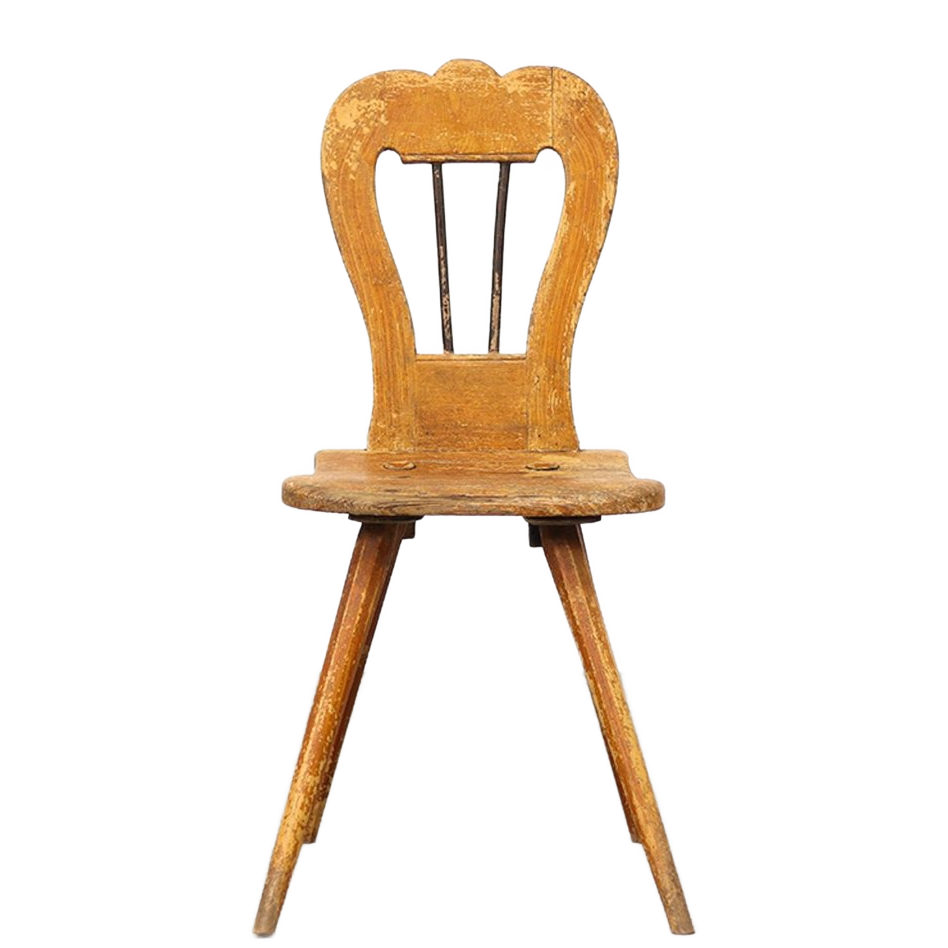 Traditionele antieke bergstoel uit Zuid-Duitsland. Deze karakteristieke en primitieve stoel is geheel met de hand gemaakt en steekt met pen-gat verbindingen in elkaar. Dit exemplaar is vervaardigd van grenenhout en is ooit geschilderd in een oker/oranje kleur. Deze oude verf is op veel plaatsen gesleten en de stoel is daarmee voorzien van een prachtig patina. Minimale gebruikers sporen zijn waar te nemen, zoals wat oude houtworm gaatjes verspreid over het geheel. Deze zijn vanzelfsprekend nagelopen en behandeld. De stoel staat stevig en is geschikt voor dagelijks gebruik. De datering ligt om en nabij 1800-1850. 45cm hoogte zitting, 88cm hoogte rug, 40cm breed, 38cm diep.