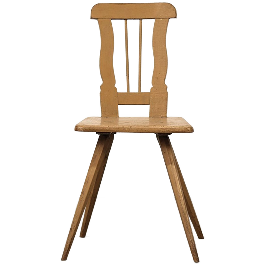 Traditionele antieke bergstoel uit Zuid-Duitsland. Deze karakteristieke en primitieve stoel is geheel met de hand gemaakt en steekt met pen-gat verbindingen in elkaar. Dit exemplaar is vervaardigd van grenenhout en is ooit geschilderd in een beige kleur. Deze oude verf is op veel plaatsen gesleten en de stoel is daarmee voorzien van een prachtig patina. De stoel staat stevig en is geschikt voor dagelijks gebruik. De datering ligt om en nabij 1800-1850. 50cm hoogte zitting, 95cm hoogte rug, 44cm breed, 40cm diep.