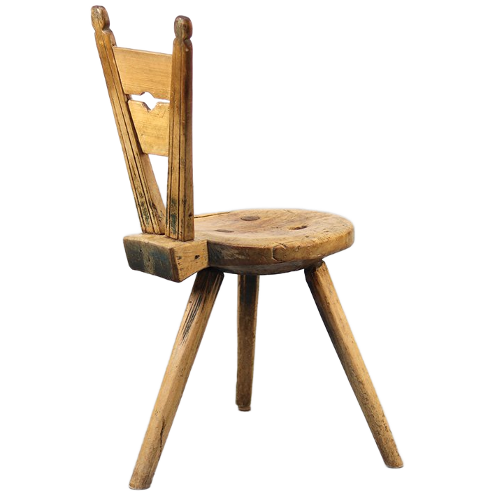 Deze driepotige stoel uit het begin van de 19e eeuw is op traditionele wijze vervaardigd, met pen-gatverbindingen en een zitting die uit één stuk hout is gesneden. Het robuuste, primitieve ontwerp wordt versterkt door het prachtige, warme patina dat de stoel na meer dan twee eeuwen heeft verworven. Deze combinatie geeft de stoel een unieke, onvervalste uitstraling. Een bijzonder decoratief meubelstuk met historie en karakter. Herkomst Scandinavië.