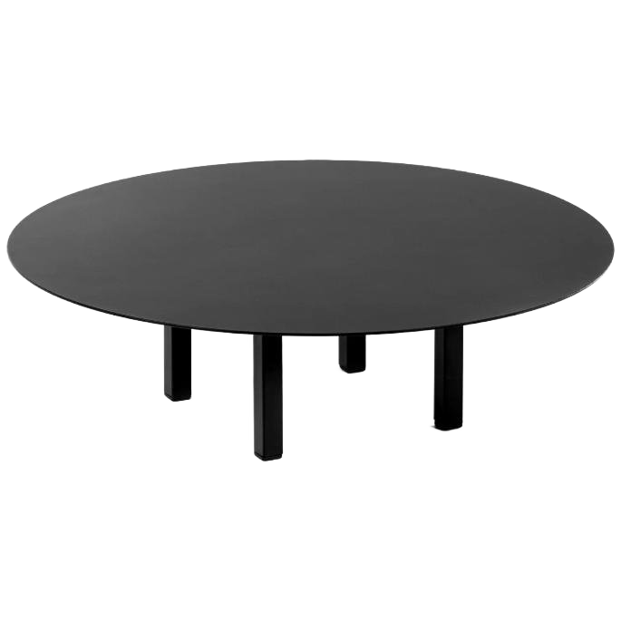 Het tafelblad is gemaakt van zwart metaal. De tafel wordt ondersteund door vier lage pootjes.