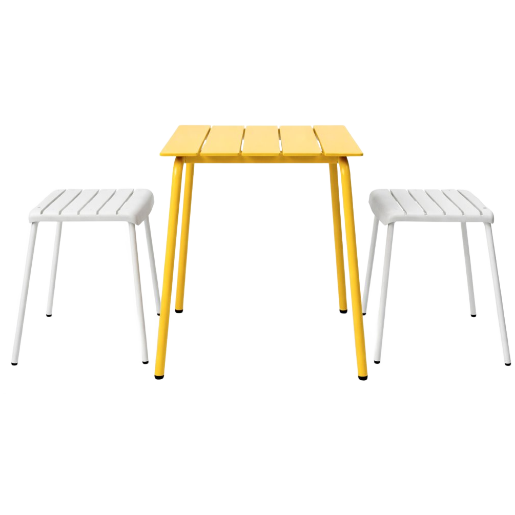 Let op: deze set bevat 1x Tuintafel S off-white en 2x Kruk yellow.