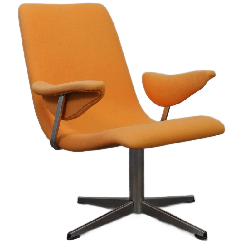 Deze sculpturale loungestoel weerspiegelt de elegantie van het Duitse modernisme in de jaren 60. Hij is geproduceerd door Goldsiegel en heeft een verfijnde draaivoet van roestvrij staal die prachtig contrasteert met het organische, vloeiende ontwerp van de zitting en armleuningen. De opvallende oranje bekleding benadrukt het speelse maar verfijnde karakter van die tijd, waardoor dit meubelstuk zowel functioneel als zeer decoratief is.