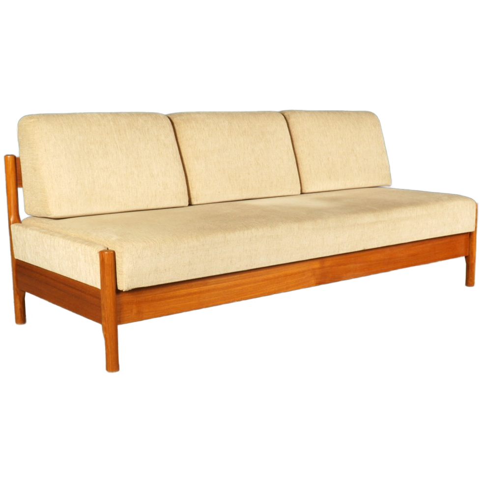 Deze geweldige driezits klepbank is geproduceerd door Den Blaa Fabrik in Denemarken in de jaren 60. Het ontwerp is zeer eenvoudig, maar zo mooi. Het frame is gemaakt van massief teakhout. De kussens en beige stof zijn origineel en in zeer goede staat, klaar voor gebruik. De bank kan simpel worden geopend door de zitting omhoog te tillen. Onder de zitting is een grote opbergruimte voor bijvoorbeeld lakens of andere op te bergen items. De bank is in zeer goede staat, waarbij de stof een zeer lichte verkleuring heeft in het middel van het zitgedeelte, wat op de foto’s te zien is als een iets lichter plekje.