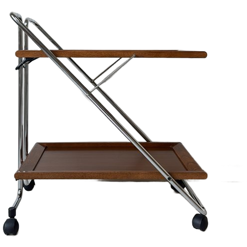 Vintage trolley / serveerwagen. De trolley heeft een mid-century moderne stijl en is gemaakt in Italië in de jaren 80. Prachtig door de combinatie van het verchroomd staal en hout. Afmetingen: 67B x 45,5D x 61H cm / Handvat 74H cm. De trolley is inklapbaar. Verkeert in hele goede vintage conditie. De trolley kan opgehaald worden in Maastricht, kan eventueel ook verzonden worden.