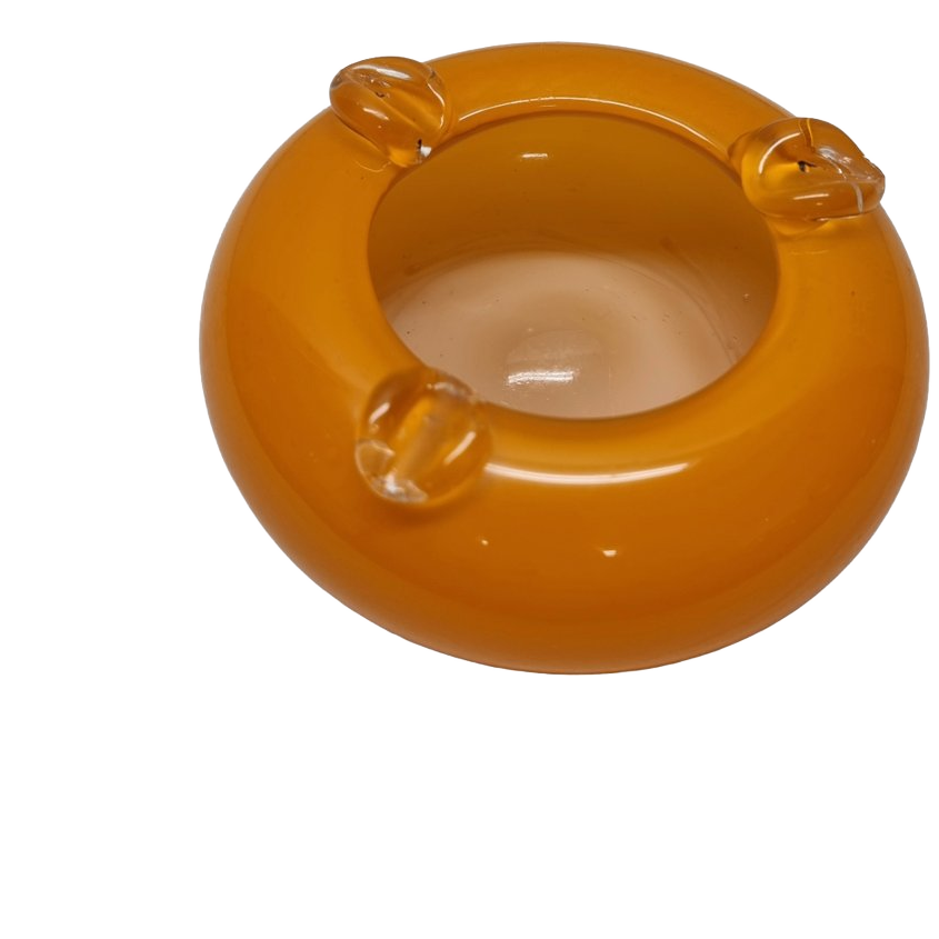Deze stijlvolle oranje glazen asbak is een prachtig vintage designobject uit de tweede helft van de 20e eeuw, vakkundig mondgeblazen in Italië. De warme oranje kleur, de zachte ronde vorm en de sierlijke, heldere glaspuntjes aan de rand geven dit stuk een luxueuze retro-uitstraling.
