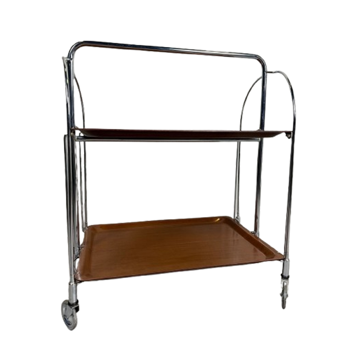 Handige vintage serveerwagen in metaal (chroom) en plywood. Heeft een ietwat industrieel karakter. Gemerkt: Gerlinol. Ingeklapt neemt het slechts 10cm ruimte in beslag. Kan ‘half’ opgesteld worden, dan is de diepte 24cm. Afmetingen: 67 x 41,5cm. Hoogte: 77cm. De wieltjes lopen mooi, de chroom is uitstekend en de bladen vertonen weinig gebruikssporen.