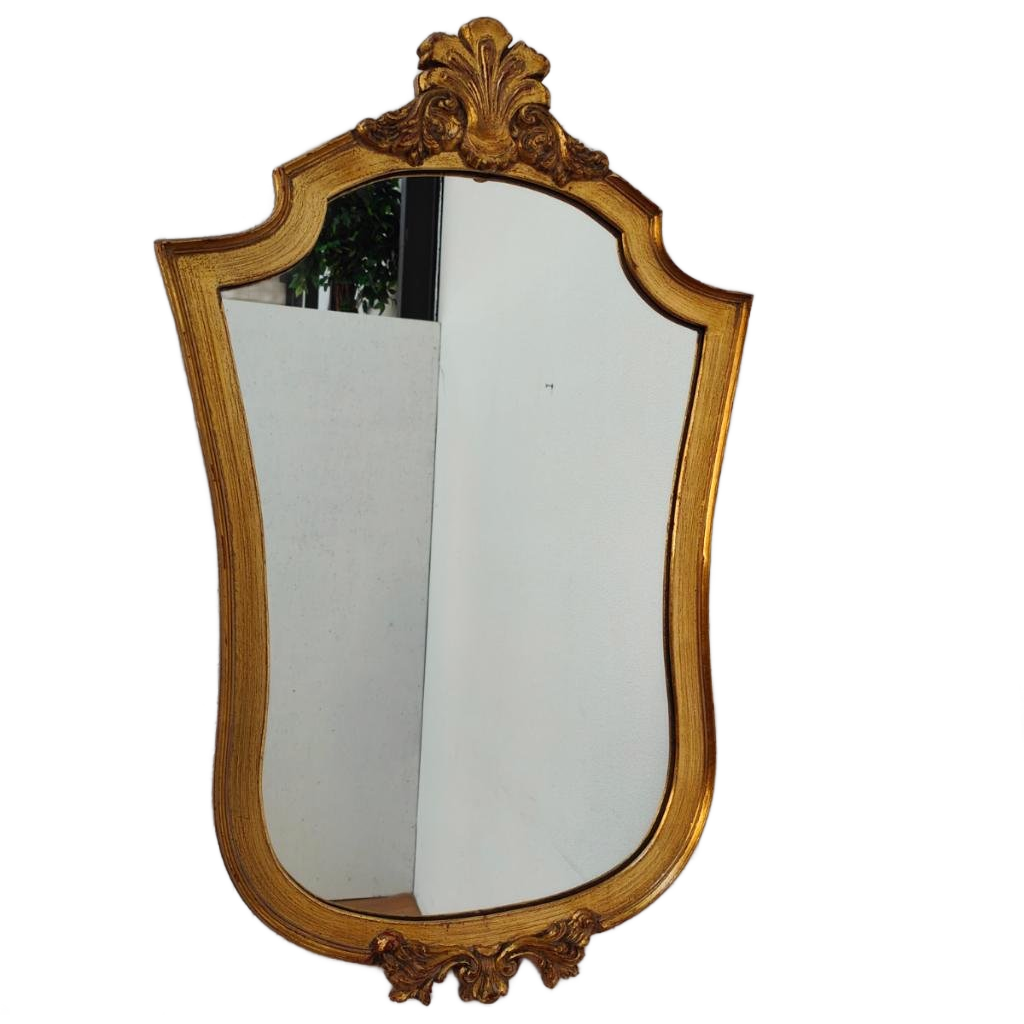 Zeer mooie elegante brocante spiegel. Mooi voor in de hal, boven de kaptafel als make-up spiegel of gewoon in de woonkamer. Super leuk in een Hollywood Regency interieur. De spiegel is in goede vintage conditie, maar kan door zijn leeftijd hier en daar wat gebruikssporen of verweerde plekjes in de spiegel hebben. De spiegel is voorbereid om opgehangen te worden. De lijst is van hout.