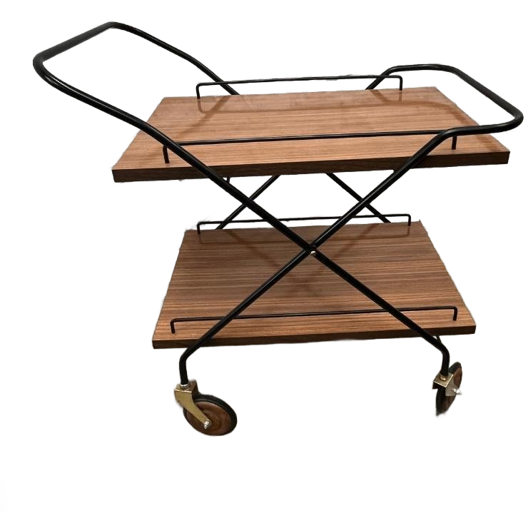Charmante vintage serveerwagentje uit de jaren ’60. De basis is gemaakt van zwart staal in combinatie met (houten!) Wieltjes waardoor je ‘m makkelijk kunt verplaatsen. De bladen hebben een houtlook en eveneens zwart stalen details. Je kunt de serveerwagen bijvoorbeeld gebruiken als barretje, bloementafel of zoals hij bedoeld is: als bijzettafel met lekkere hapjes.