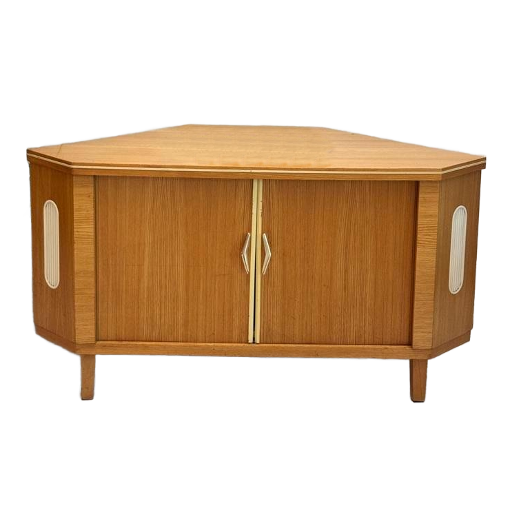 Leuk en zeldzaam vintage barkastje uit de jaren 50/60. Dit bijzondere barkastje herbergt een geheime minibar achter het roterende binnenwerk. Met een simpele draai, tover je je geheime drankvoorraad tevoorschijn (en weer weg). Het binnenwerk bestaat uit een plankje enerzijds en een vak met flessen- en glazenhouders en n spiegel. Dit mooie barkastje is gemaakt van honingkleurig houtfineer met kunststof accenten. Cocktailtime it is!