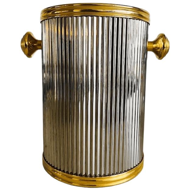 Vintage verzilverde wijnkoeler, helemaal in Hollywood Regency stijl uit de jaren 70. De drankjes koeler is gemaakt van metaal en kunststof en heeft een luxe uitstraling. De wijnkoeler is in goede vintage staat en 16,7 cm hoog, 16,5 cm breed en heeft een doorsnede van 11,5 cm.
