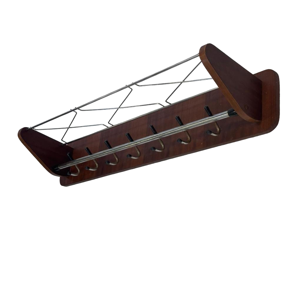 Deze vintage wandkapstok komt uit de jaren 60/70 van de vorige eeuw en heeft een rek en haakjes van chroom en een teak gefineerd frame. Bekijk de foto's voor alle details!
