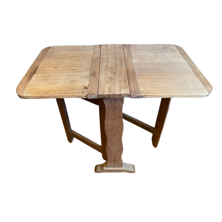 Een heel mooi 19e eeuws wijnproeftafeltje uit Frankrijk. Ook dit soort tafeltjes gebruikten ze bij proeverijen. Makkelijk om er even bij te zetten. Dit model is best sierlijk met zijn golvende voorkant. Gemaakt van beukenhout. Ook leuk als bijzettafeltje te gebruiken of om even aan te werken. Hij is niet zo groot. Breedte: 90 cm. Breedte 1 kant uitgeklapt: 54 cm. Beide kanten ingeklapt: 18 cm boven Ingeklapt onder: 29 cm. Hoogte: 71 cm. Diep: 55 cm.